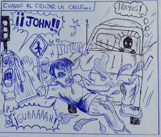 Historieta parodia de Street Fighter, Mortal Kombat, Tortugas Ninja y Los Simpsons. Hecha en 1995 para un concurso escolar.